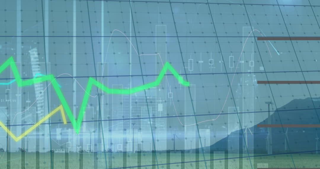 Animation blends digital data with a scenic landscape featuring wind turbines, symbolizing the intersection of technology, finance, and sustainable energy. Useful for presentations on renewable energy, financial markets, and digital data analysis. Suitable for global business and tech events.