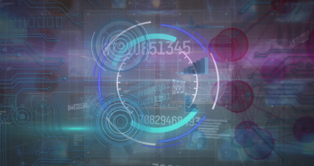 A dynamic and futuristic visual displaying a heads-up display (HUD) interface with changing numbers and neon circles resembling a scanner overlaid on schematic of microprocessor connections. Ideal for illustrating concepts related to modern technology, global networking infrastructure, and digital business solutions. Suitable for use in presentations, websites focusing on innovative tech topics, and promotional materials for tech-driven firms.