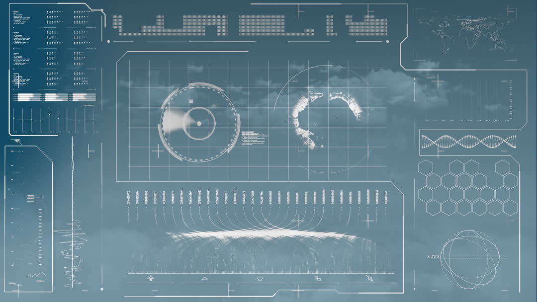 This animated background depicts a digital interface concept, showcasing data processing elements overlaying clouds. Useful for technology presentations, global business discussions, and digital feature videos, conveying a sense of modern analytics and innovative communications.
