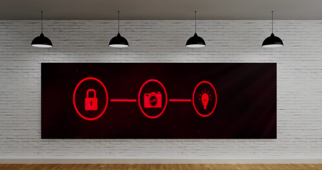 This visual showcases a modern digital interface animation with glowing red icons on a television monitor mounted on a white brick wall. Ideal for use in presentations or marketing materials related to technology, data networks, or secure communication systems.