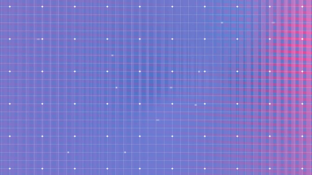This abstract digital animation features white spots moving over a purple gradient background with a grid pattern. Useful for illustrating concepts in global business, digital technology, and computing. Ideal for presentations, websites, or marketing materials centered around innovation and modern aesthetics.
