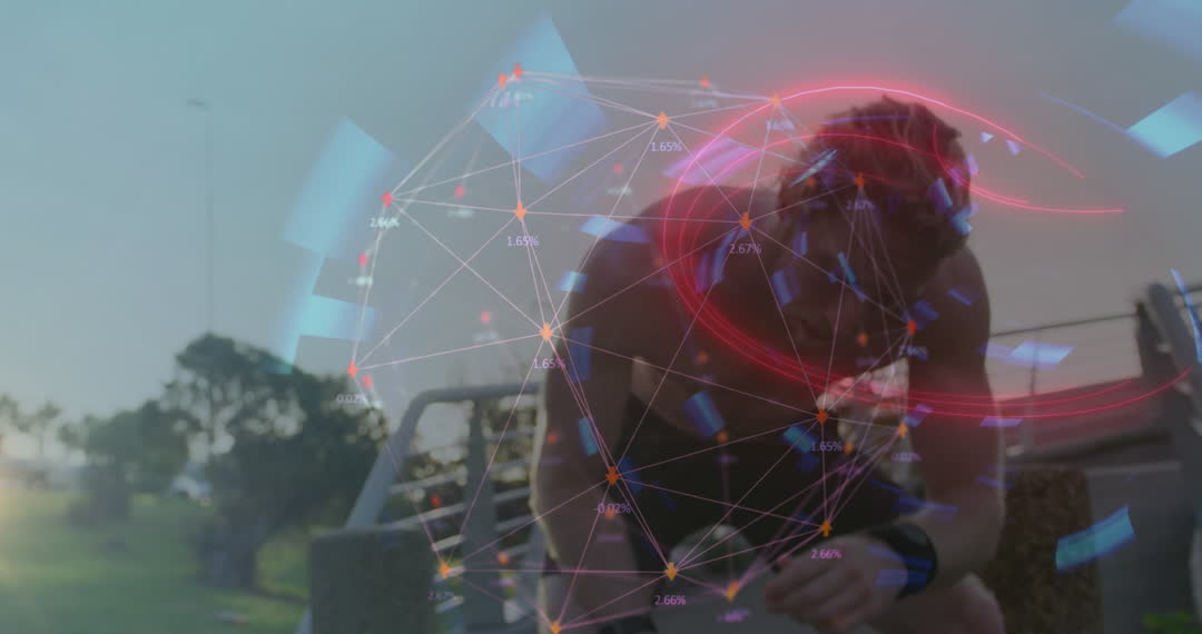 Futuristic animation showcasing digital network interfaces projected over athlete outdoors, illustrating integration of technology in sports. Useful for themes related to digitization, innovation, global connections, or depicting future of athletic training powered by digital analytics.