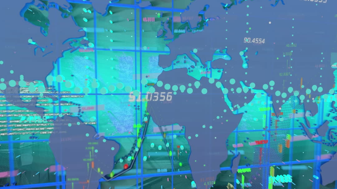 Abstract animation showing digital data overlay on world map representing global communication and business. Numbers and graphs hint at connections in finance and technology sectors. Ideal for representing concepts of globalization, financial markets, and data analysis in modern tech-oriented presentations or media projects.