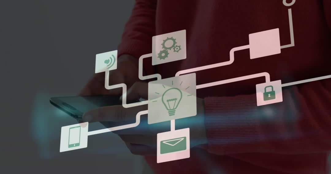 Animation depicts a network of various technology-related icons overlaying a person typing on a keyboard. Iconography represents concepts like connectivity, communication, and cybersecurity. Perfect for illustrating articles about innovation in technology, digital transformation, or concept visuals for businesses involving advanced tech solutions.