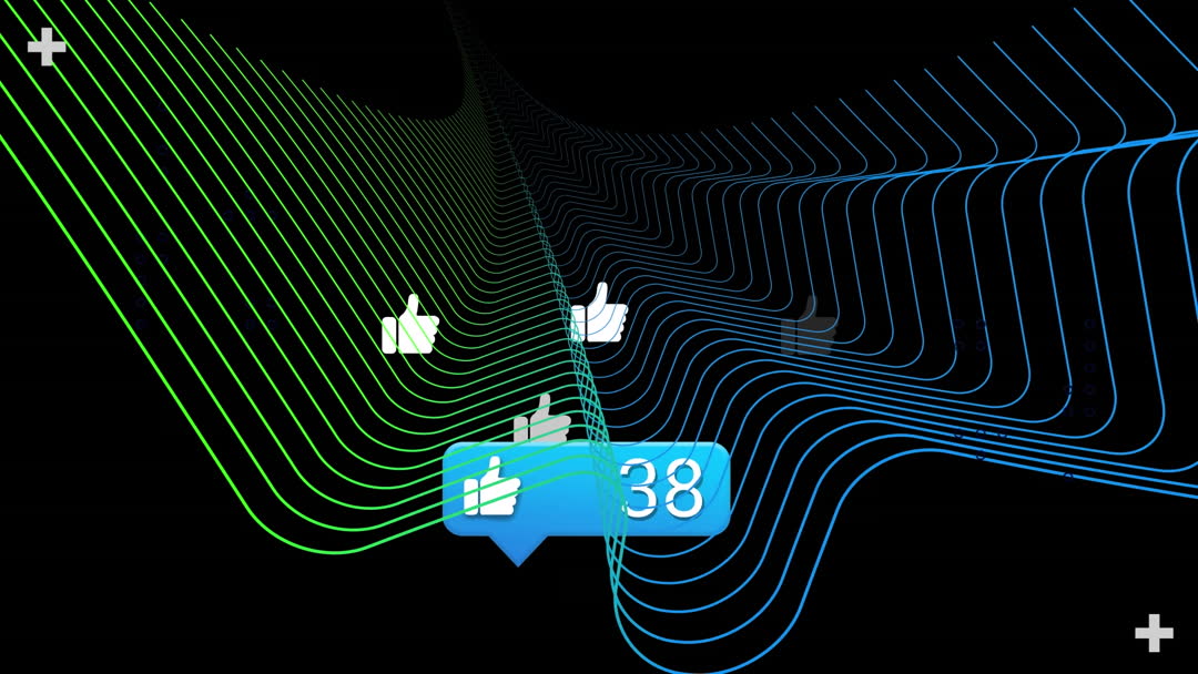 Animation showcases abstract data processing with thumbs up icons, representing digital interaction. Suitable for presentations on virtual communication, digital marketing, and tech industries.