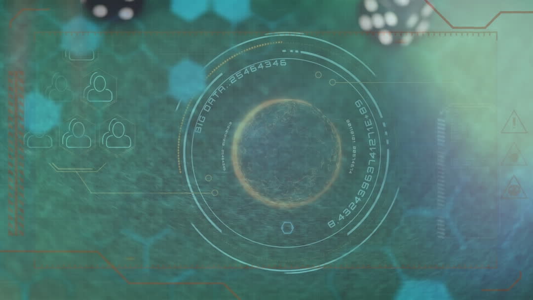 This is an animation depicting an interactive digital interface with theoretical data visualization concepts. The blending of elements such as dice suggests themes of technology and gambling intertwined. Ideal for use in technology presentations, casino-related projects, or promotional material in entertainment industries focusing on futuristic themes.