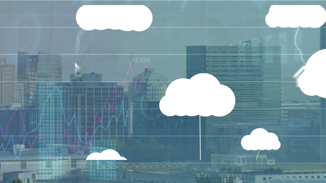 This animated scene overlays a vibrant cityscape, integrating cloud motifs and digital data engagement animations. Ideal for use in presentations or projects related to business technology advancements, global networking strategies, and futuristic urban developments.