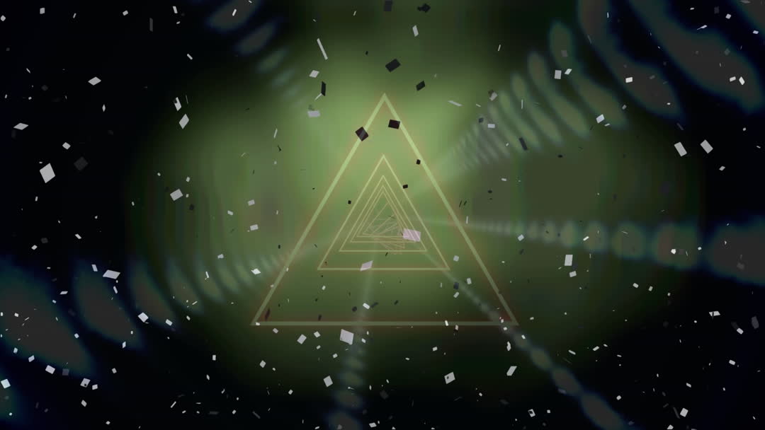 Abstract animation features dynamic triangles and floating confetti-like shapes against a black background. This design embodies a futuristic and modern digital theme, making it ideal for use in technology presentations, digital marketing content, or creative video backdrops. The geometric and dynamic visual elements capture attention and convey a sense of digital innovation and connectivity.