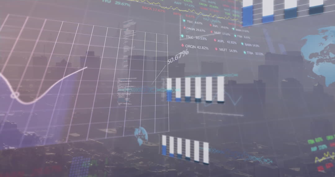 Digital interface animations hover over a city skyline, ideal for themes involving technology integration, modern urban developments, finance, or global business contexts. Suitable for presentations illustrating digital transformation in urban environments, technology-driven cities, and futuristic business strategies.