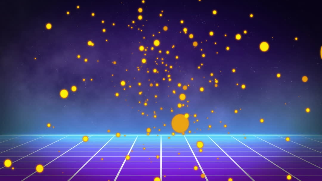 This vibrant digital animation features luminous yellow particles dynamically scattered over a grid of neon squares against a dark backdrop, evoking a futuristic and high-tech ambiance. Ideal for illustrating concepts related to technology and digital interfaces, it can be used in presentations, video projects, or tech-themed advertising to convey innovation and modernity.