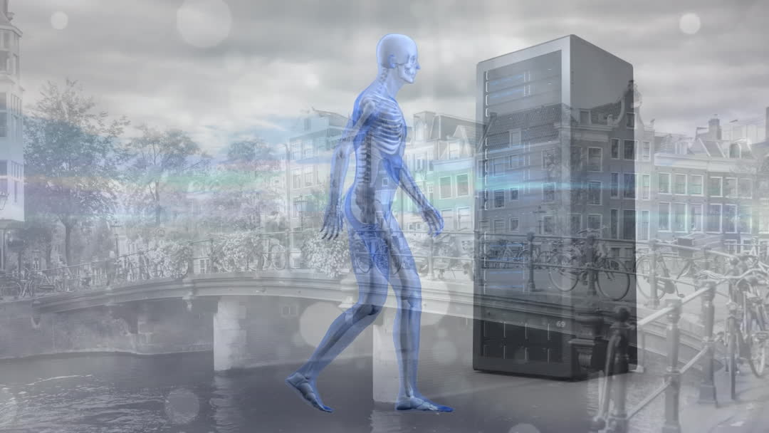 Digital Interface Concept with Skeleton and Cityscape Overlay Video
