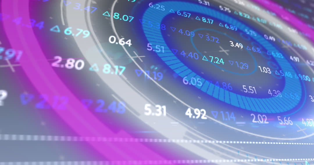 This video features an animated environment showcasing digital data processing elements intertwined with colorful circular scope elements. Numbers and abstract indexes represent dynamic data. It is ideal for brands concentrating on digital insights, financial services exhibiting market activities, or technology sectors emphasizing analytics and monitoring environments.