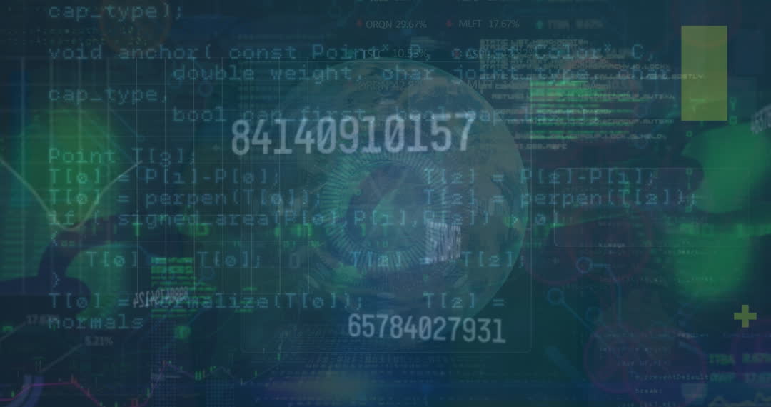 Visual depicts overlay of digital data, complex numbers, and graphics integrating across a globe, symbolizing digital interface and global data processing. Ideal for illustrating concepts related to big data, global connectivity, artificial intelligence analysis, and technological innovation in presentations or educational materials.