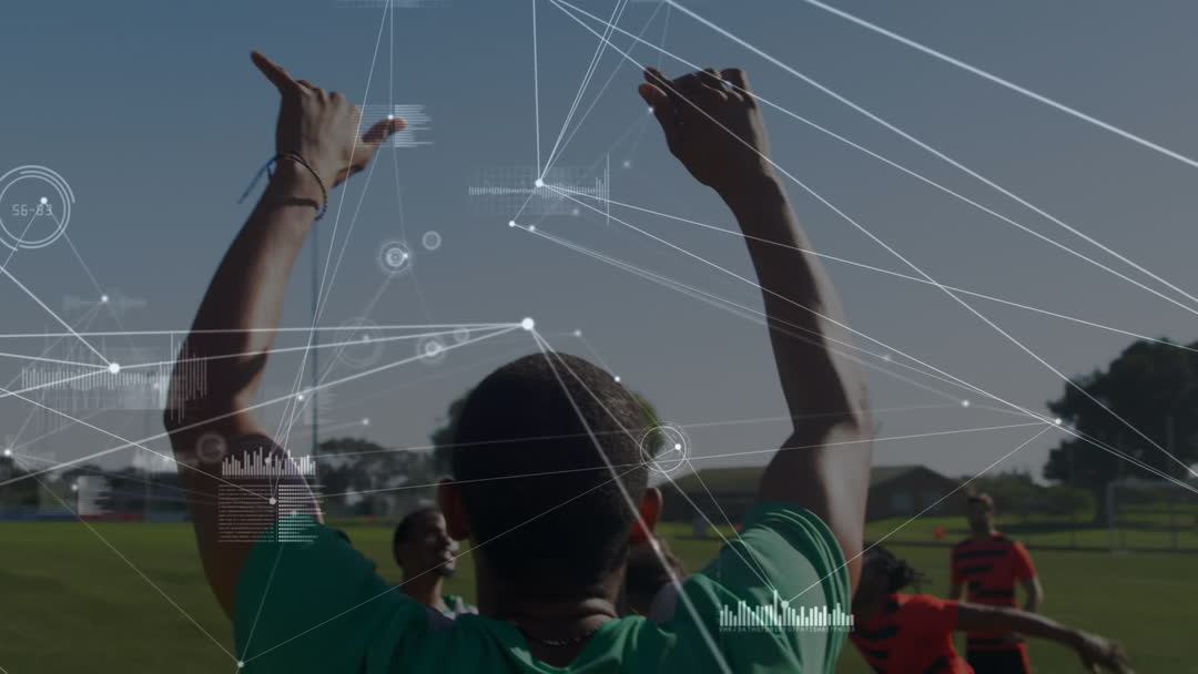 Features group of football players connected by an animated digital network. Captures technological innovation in sports with focus on data-driven strategies. Suitable for showcasing future of sports technology, teamwork enhancement in sports, or digital transformation in athletics.