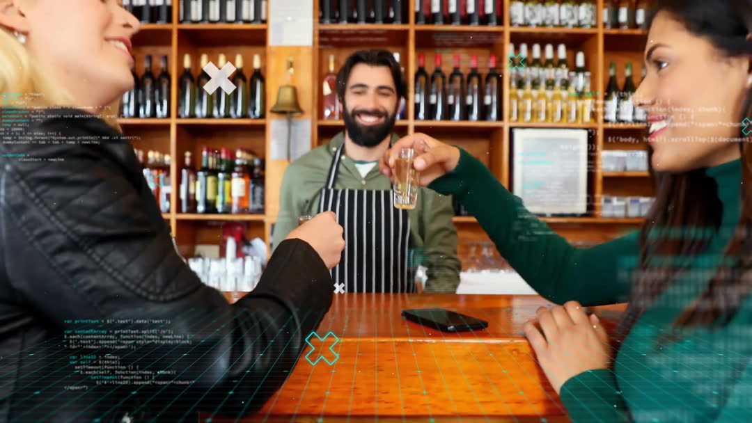 Two diverse female friends enjoying drinks at a bar, overlaid with data processing graphics, blending social interaction with digital technology. This could be used for promoting nightlife venues, enhancing digital marketing campaigns, or illustrating the concept of technology in social settings.