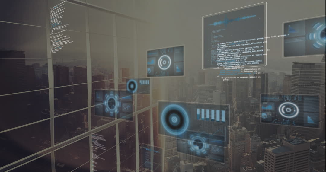 - Digital Interface Icons Over Modern Cityscape Illustration