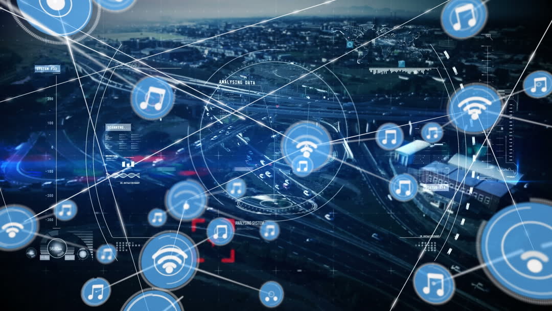 Animation shows interconnected digital icons over city, illustrating a conceptual digital network overlaying an urban area. Useful for themes involving future smart cities, interconnected technology solutions, Internet of Things concept, or digital communication platforms tutorials or presentations.