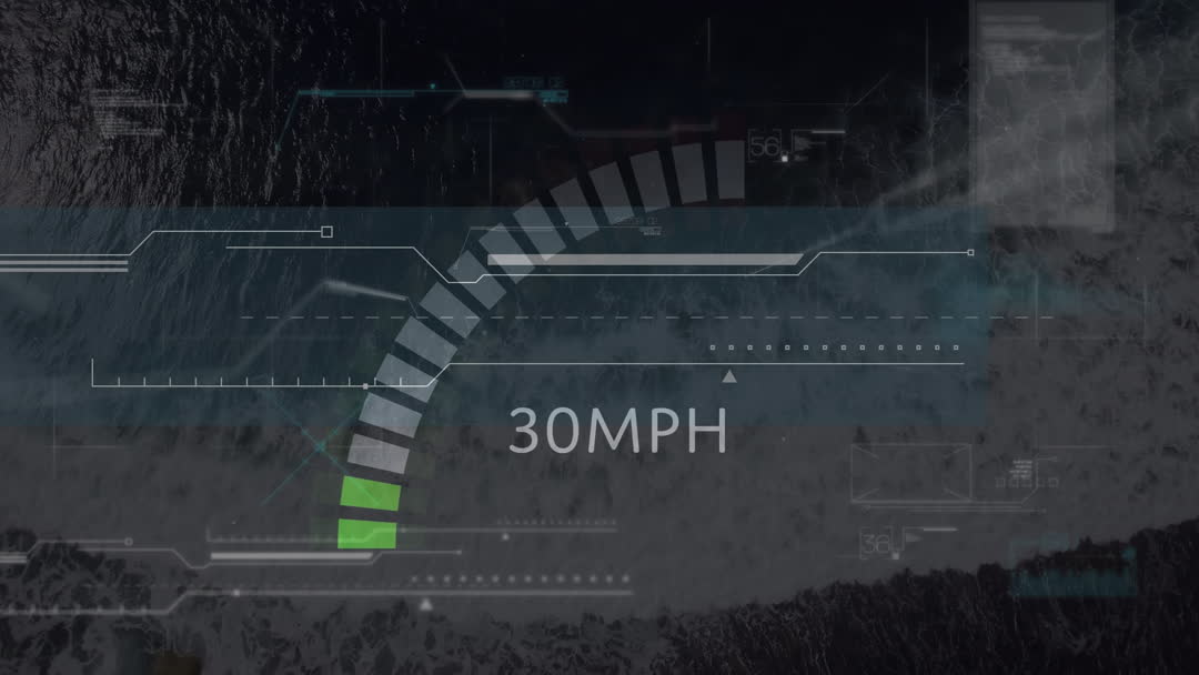 Futuristic digital interface showing animated data processing overlaying an aerial view of landscape. Numbers and graphics suggest high-tech monitoring of speed at 30 MPH. Ideal for projects related to global technology, computing, digital data visualization, or advanced analytics. Use in tech presentations, innovation strategy studies, or modern data tracking topics.