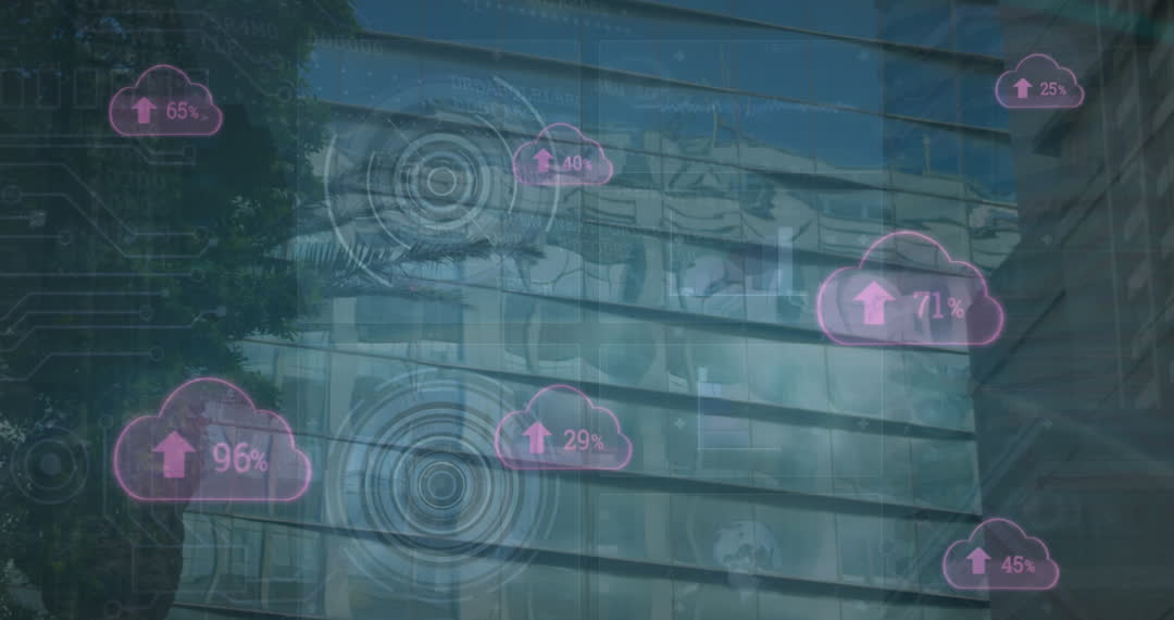This video illustrates a digital interface overlay on a cityscape, showcasing data processing in global finance and technology. The presence of modern buildings and cloud symbols suggests connectivity and trends in economy. Useful for topics related to digital technology, the finance sector, and smart city innovations.