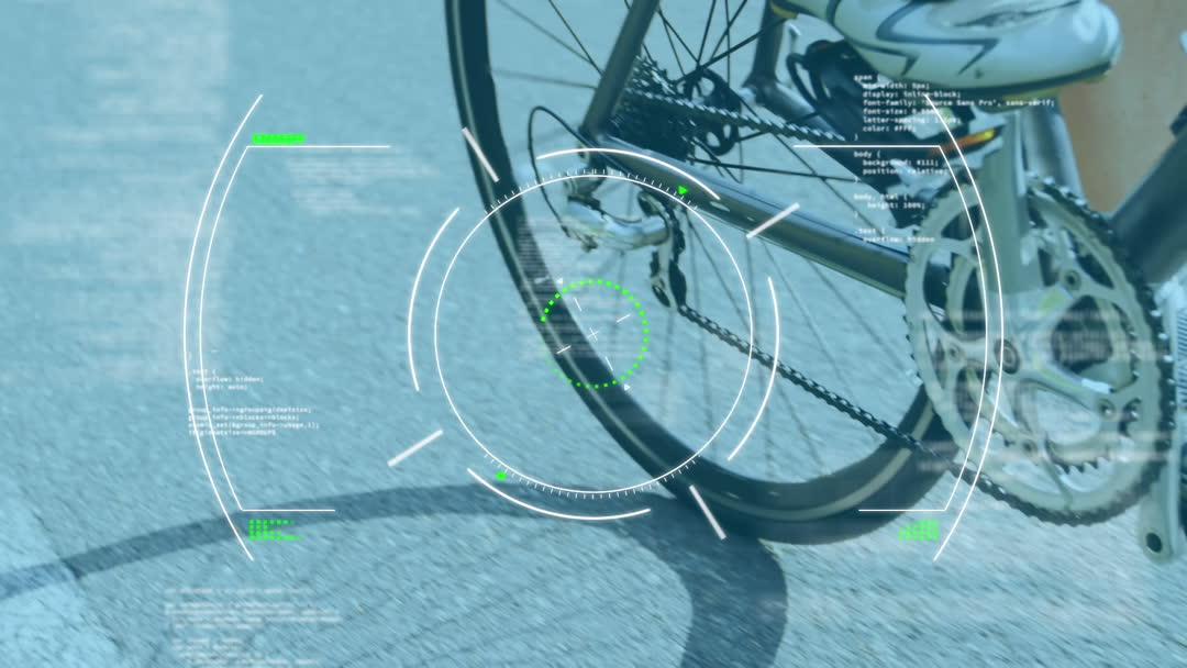 This video depicts a futuristic digital interface superimposed over a bicycle wheel, indicative of advanced technology and data analytics. Suitable for illustrating themes of innovation in transportation or smart technology. Can be used in articles discussing advancements in digital health, smart cities, or transportation technology.
