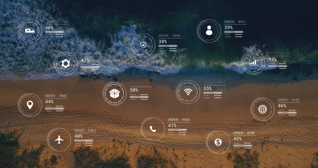 This visual composition seamlessly blends nature and technology by superimposing data processing visuals and icons over an idyllic seaside landscape. The video effectively illustrates concepts such as global connectivity, digital networks, and technological innovation. It is an ideal choice for creative projects emphasizing modern technological solutions or futuristic themes, such as presentations, advertisements, or educational materials.