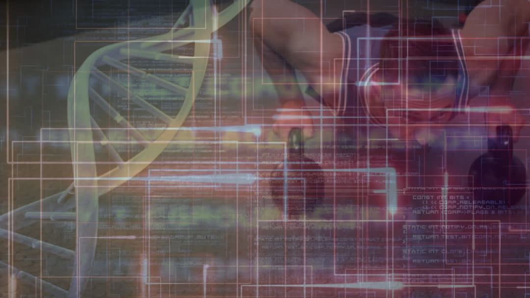 This visual combines digital data elements with a man working out, symbolizing the integration of technology in fitness and health science. The presence of a DNA strand suggests themes of genetics or personal health optimization. Ideal for articles, presentations, or content on fitness technology, health advancements, or genetic analytics.