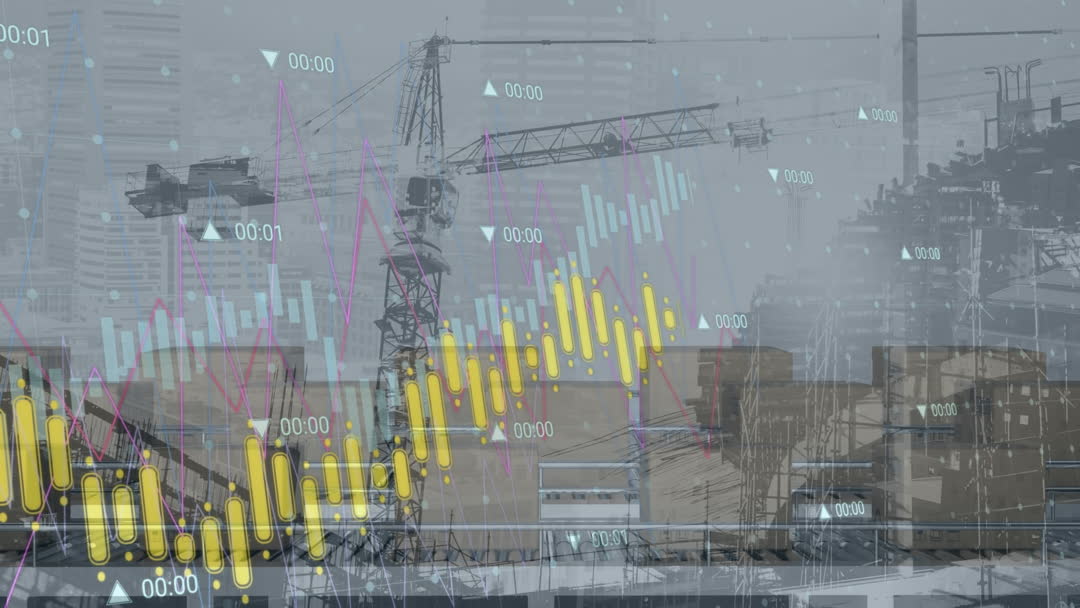 The video shows a digital interface with financial data and graphs overlaid on an urban construction scene. Ideal for illustrating content related to technology advancements in infrastructure, real estate markets, business analytics, or innovative city planning strategies.
