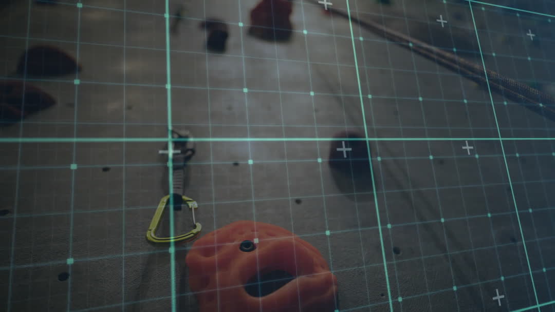 Grid of digital lines moves over colorful climbing holds providing an innovative perspective. Useful for illustrating intersection of technology with recreation and sports industry. Ideal for content focused on innovations in fitness, immersive experiences, or digital graphics.