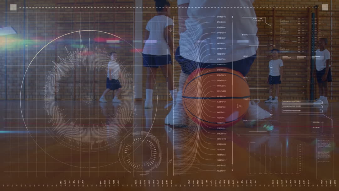 Features a digital overlay of information on youth training for basketball, symbolizing the merging of sports and technology. Ideal for illustrating concepts in sports analytics, modern training techniques, or presentations on technology integration in athletics.