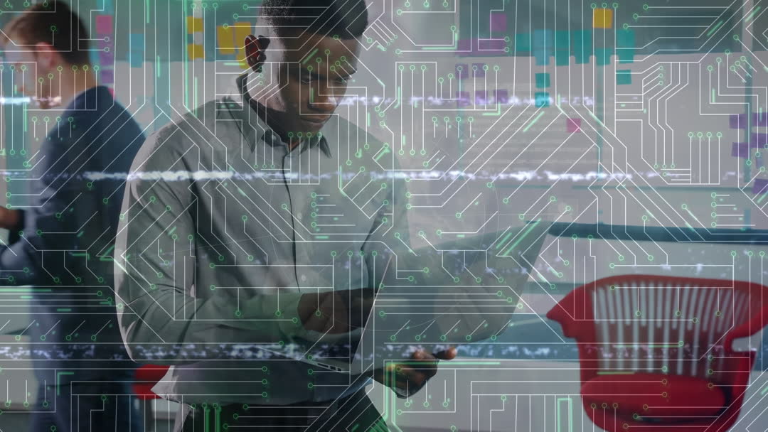 Conceptual video combining digital technology with business. Features a businessman using a laptop with circuit board graphics overlaid, symbolizing digital transformation and innovation. Useful for illustrating topics in business technology, digital interfaces, and software development.