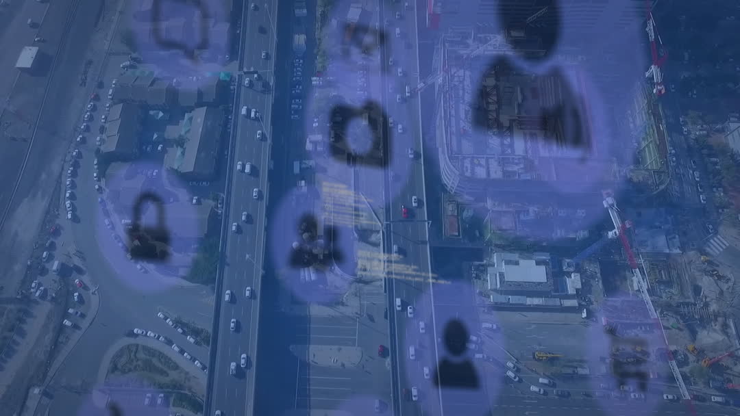 - Digital Interface Overlay on Cityscape with Iconic Data Symbols