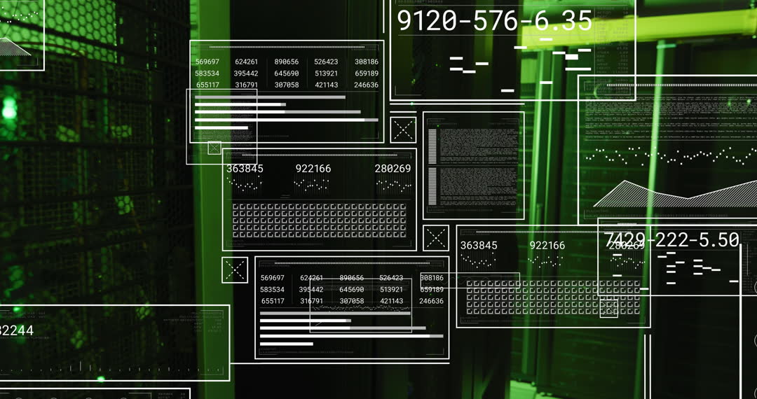 Overlays of digital interface elements appear over server racks tinted in green, showcasing numbers, graphs, and shapes. This video is ideal for use in technology-focused presentations, videos about data centers, and articles discussing networking and cybersecurity.
