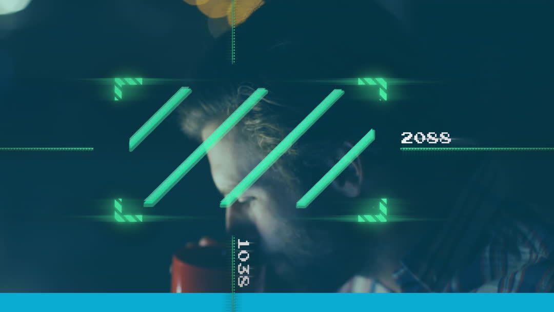 Digital Interface Overlay on Man Working Late with Coffee Video
