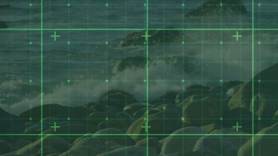 Green digitized grid runs across a scenic coastal view, depicting intersection of technology and natural landscape. Rolling waves crash on rocks, symbolizing traditional nature complemented by a digital framework. Ideal for projects exploring technology in nature, modern design, futuristic themes or as a background for tech-focused presentations.