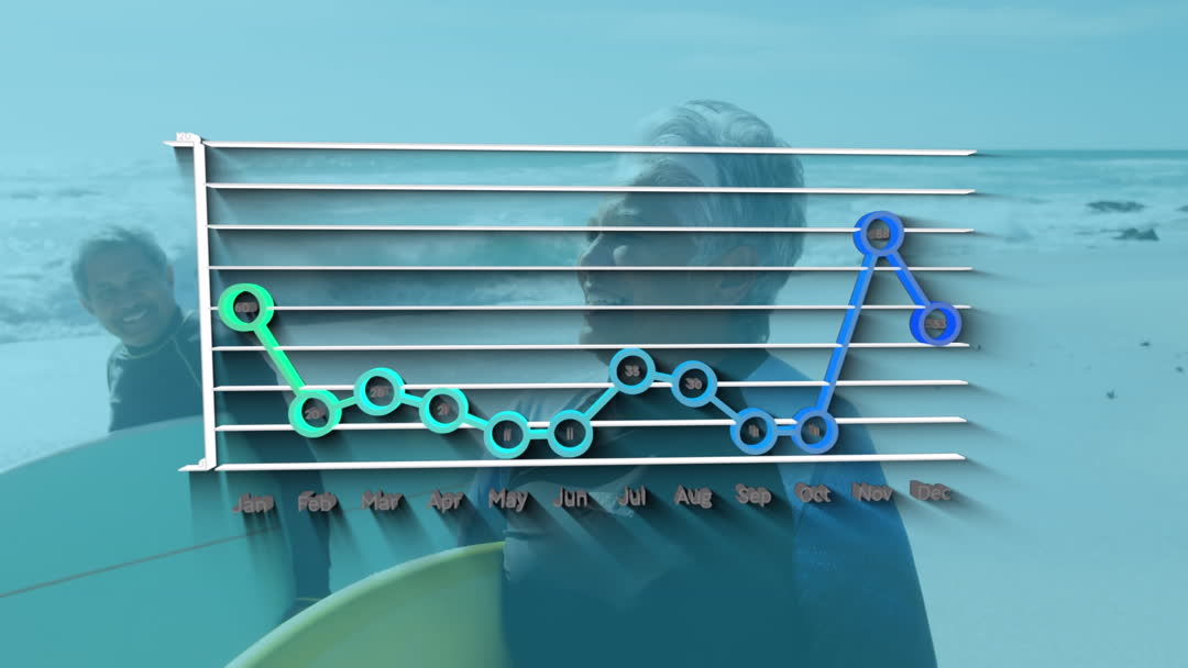Image showcases an animated graph overlay on a senior couple at beach, representing merging technology into daily life experiences. Perfect for uses in articles about digital transformations in later life, evolving retirement insights, and technology integration with outdoor experiences, combining lifestyle with data examination envisioned for digital interface promotion.