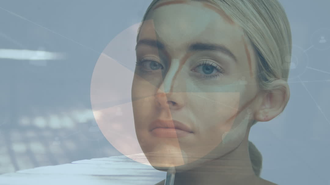 Creative depiction of woman highlighting facial angles while digital interface elements symbolize data processing. Ideal for themes exploring the intersection of technology with daily life, makeup influences on digital simulations, or the artistry of adapting traditional tasks into modern setups. Usable for marketing beauty tech products or finance innovations.