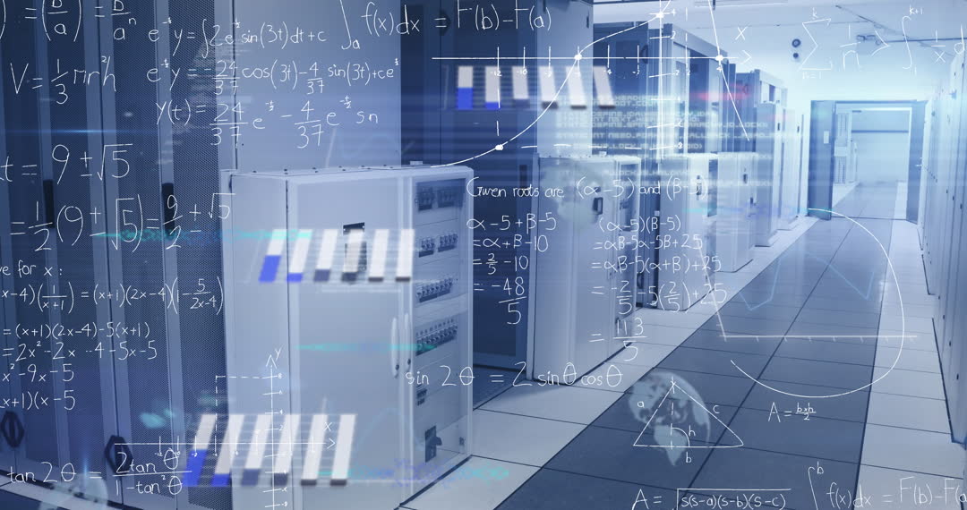 Mathematical equations covering a server room illustrate concepts of data processing and technology, ideal for content related to information technology, data analysis, server performance, and innovative computational solutions across digital platforms. Utilized in educational materials, technology blogs, business publications or as a visual representation of digital transformation.