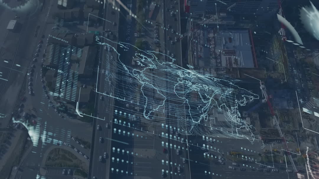 Abstract visual combining a city aerial view with a digital overlay that illustrates data and networking concepts. This video can be used for projects focusing on urban development, technology integration, global business analytics, or digital transformation. Suitable for presenting themes on modern communication, future cities, or innovative business solutions.
