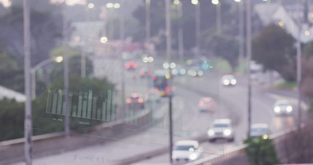 Image depicts an urban scene with digital data graphs overlaying a busy city road. Perfect for articles on data analysis, urban planning, transportation efficiency, or technology integration. It suggests a connection between digital technologies and real-world applications in transportation and city traffic management.