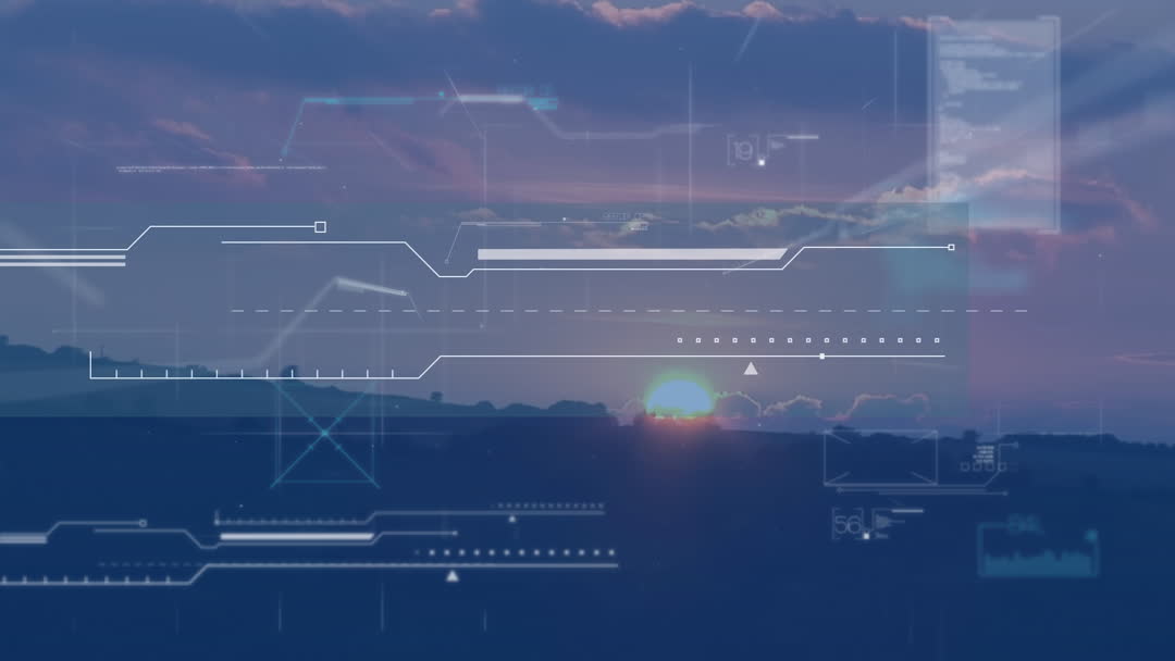 Digital Interface Overlaying Sunset Landscape with Data Graphics Video