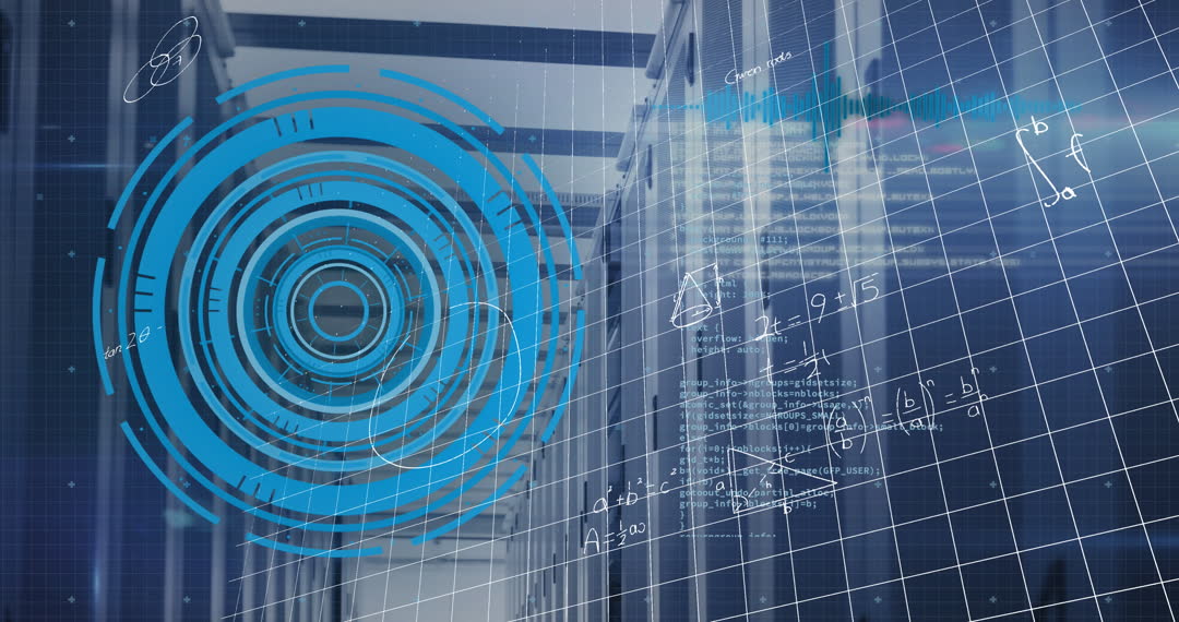 Digital overlays exhibit futuristic technology combined with mathematical equations against the backdrop of a server room. This versatile conceptual design is perfect for illustrating topics related to IT infrastructure, modern data processing, and digital innovation.