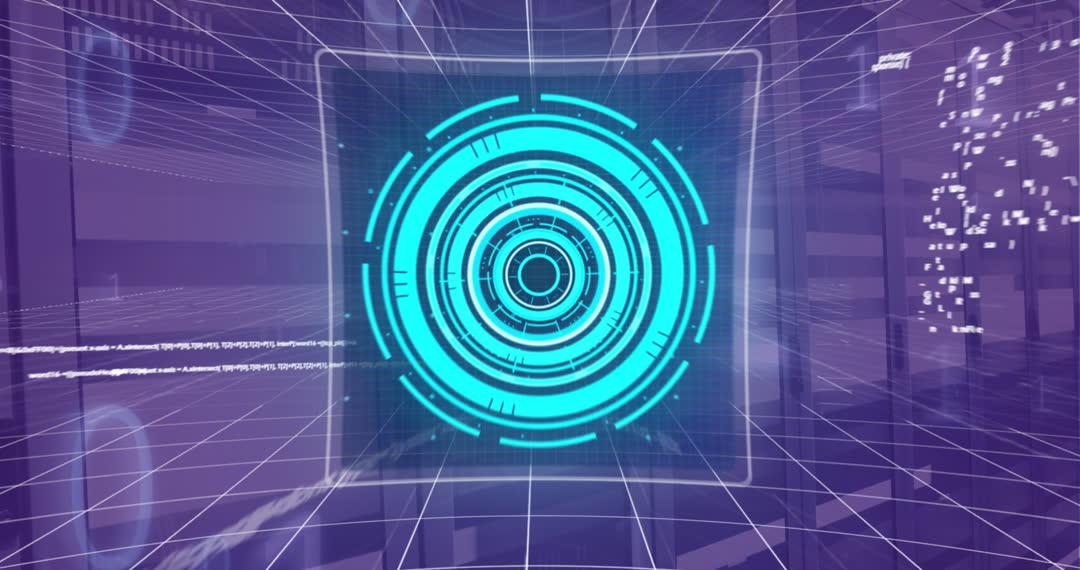 The video depicts a digital interface featuring a scope-like scanning animation against a futuristic, technology-themed background with data overlays and gridlines. Ideal for blogs and articles about cybersecurity, data analysis, virtual reality advancements, or technology innovations. Suitable for educational materials on network security or promotional material for tech companies.