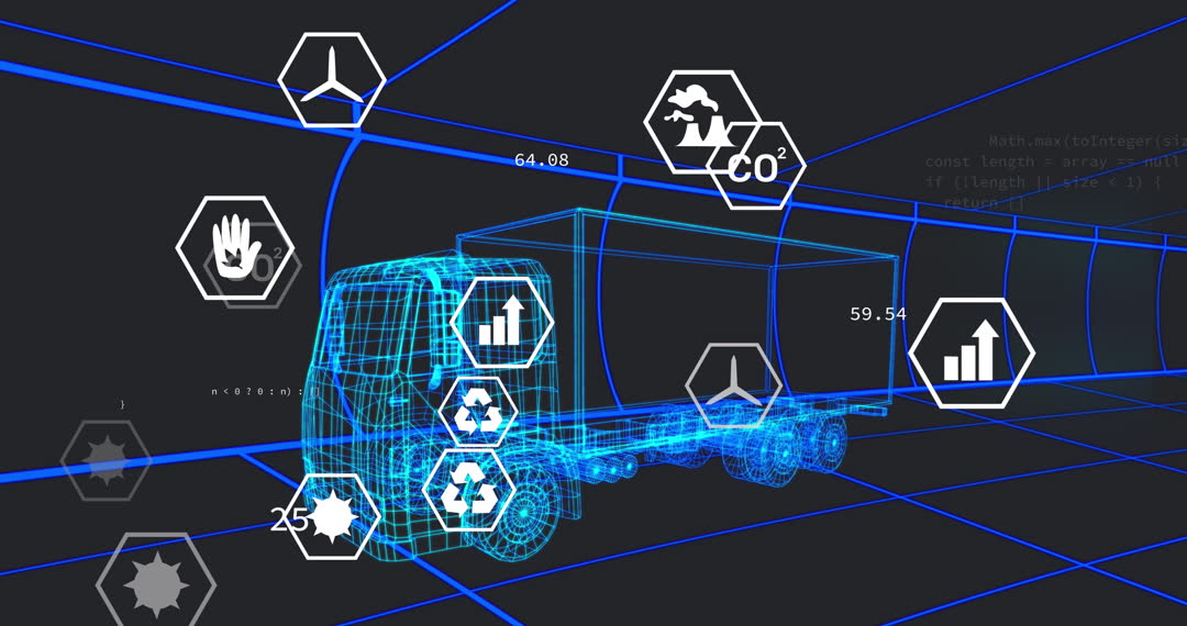 A digital interface showcases a 3D truck model enhanced by data icons representing efficiency, sustainability, and technological advancements. The design conveys concepts related to modern transportation, business technology, automation, and green innovation. Useful for articles on futuristic vehicle developments, technology in logistics handling, and educational materials on sustainable business models.