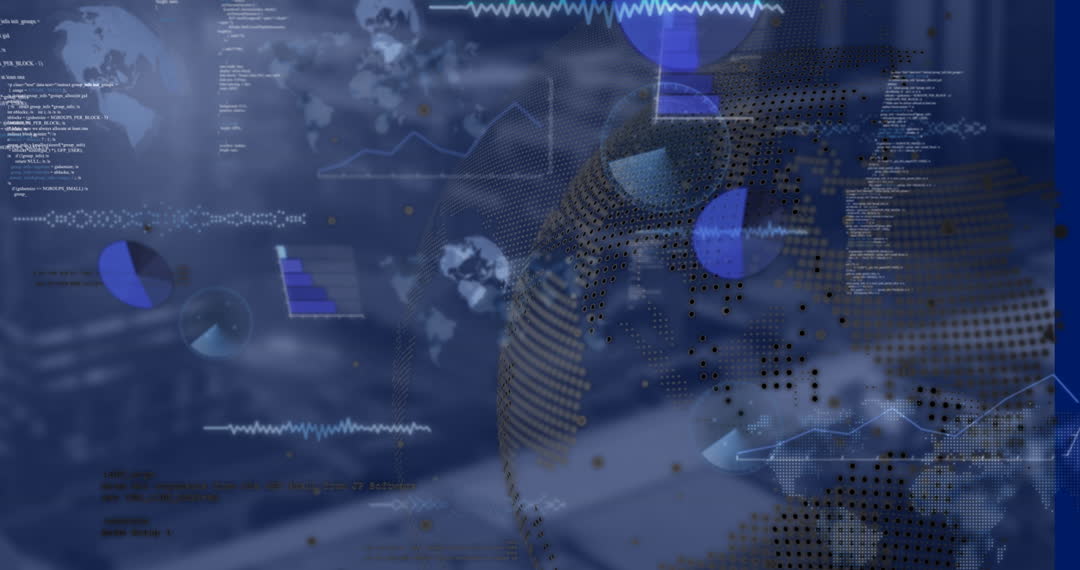 This digital visual showcases abstract data visualization elements over a blurred background, featuring multiple styles of data graphs and analytics symbols. Ideal for use in business and technology categories to enhance presentations, websites, and multimedia projects related to digital transformation and global commerce.