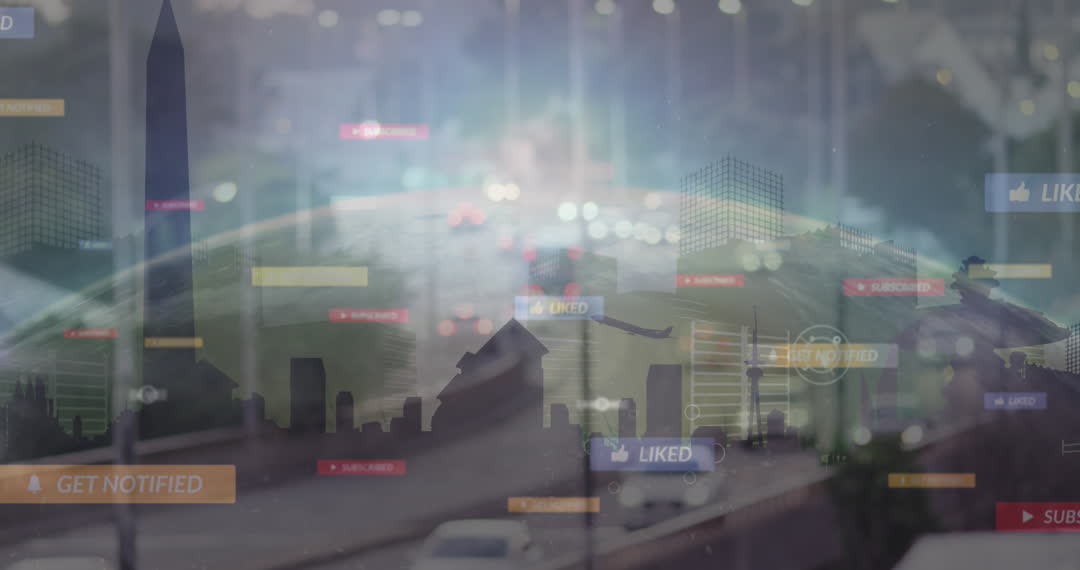 A creative digital interface showcasing abstract technology elements and dynamic connectivity overlaid on a cityscape background. The video captures the essence of modern digital communication, highlighting elements like 'Get Notified', 'Liked', and 'Subscribed'. Suitable for illustrating themes related to online media, digital promotion techniques, modern networking strategies, and virtual community engagement.