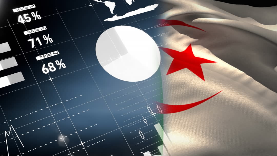 Image displays finance and technology theme with Algerian flag and various data points. Useful for articles on Algerian market, data analysis technologies, and global economic forums.