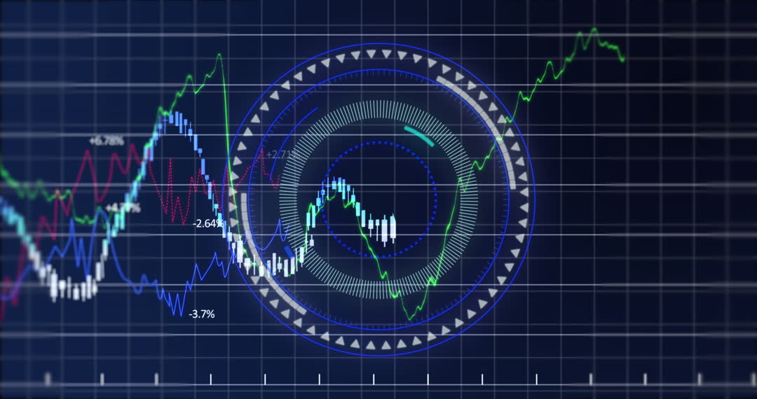 This digital representation depicts a technology-focused interface featuring animated graphs, ongoing data processing, and scope circles against a blue grid background. It suggests themes of global business, digital analytics, and futuristic data processing systems. Ideal for use in presentations about financial services, digital infographic content, or technology trend discussions.