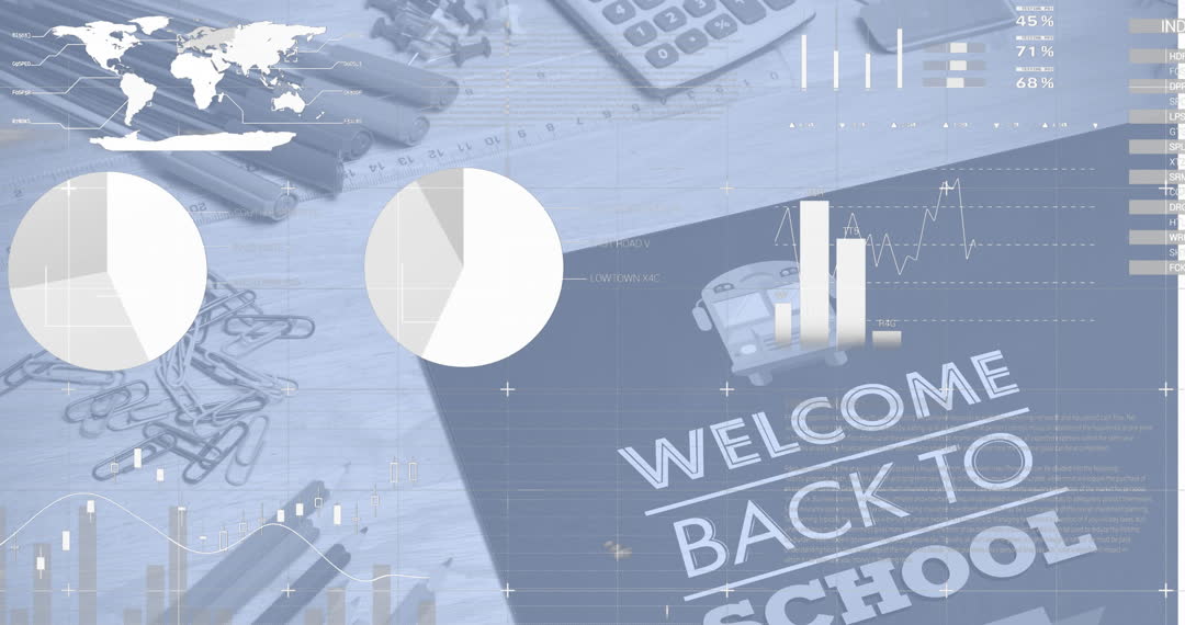 Background showing digital data graphics overlaying school items such as pens and paper clips, alongside the text 'Welcome Back to School'. Elements highlight the modern integration of technology in education and can be used for presentations, educational materials, or illustrating future trends in educational methodologies.