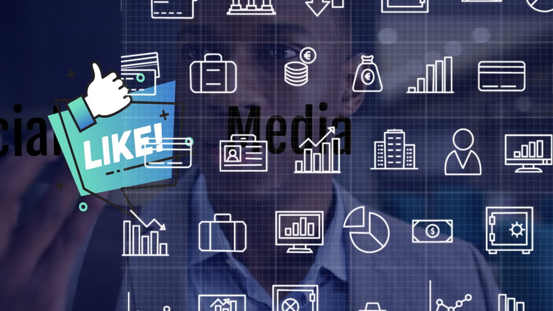 The visual contains animated business and social media icons overlaying a background. It communicates themes related to modern technology, data interaction, and social connectivity. Suitable for illustrating concepts in digital marketing, financial technology, or information management services. Ideal for online platforms or presentations focused on advancements in virtual business operations.
