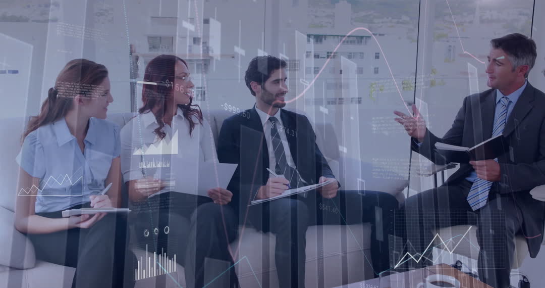 Group of colleagues in professional attire engaged in a business meeting. Animated financial data displays overlays on the backdrop, symbolizing modern business analysis and data-driven decision-making. Suitable for promoting themes of teamwork, innovation in finance, or digital transformation pursuits in corporate contexts.